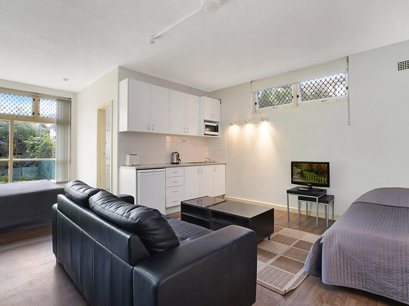 The Studio apartments are similar to an “L shaped” hotel room with an ensuite bathroom. The sleeping area is at one end, and a kitchenette and the lounge is at the other. Each studio has the same level of quality furnishings (listed below) and has access to natural light and ventilation with opening windows.